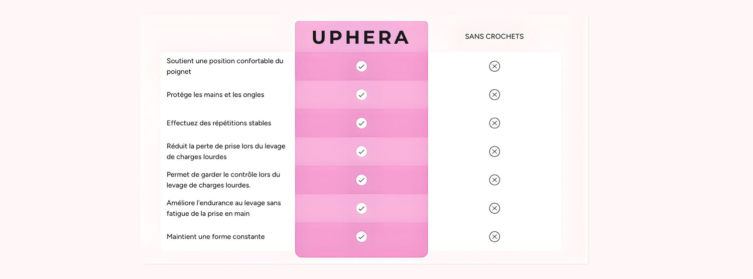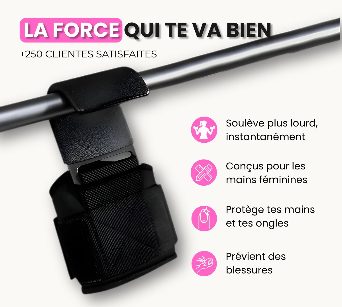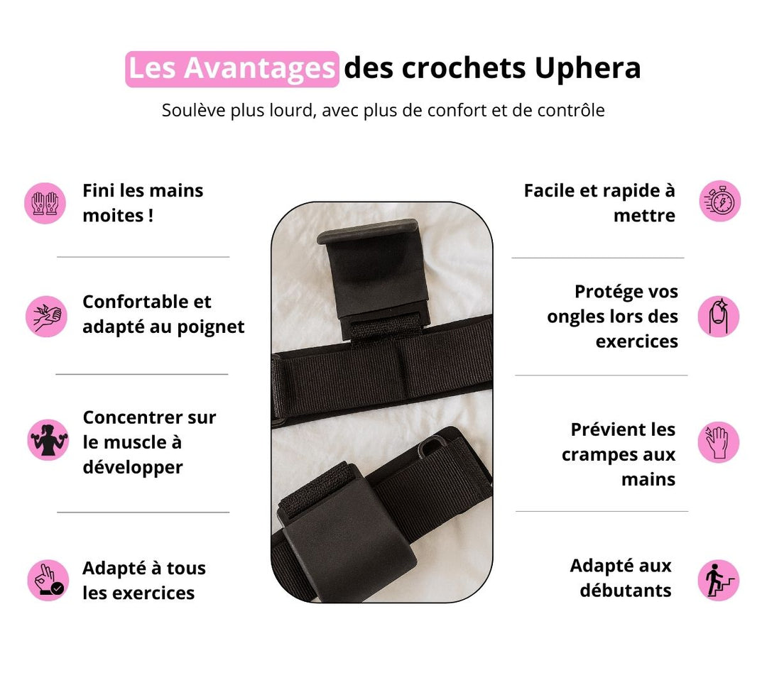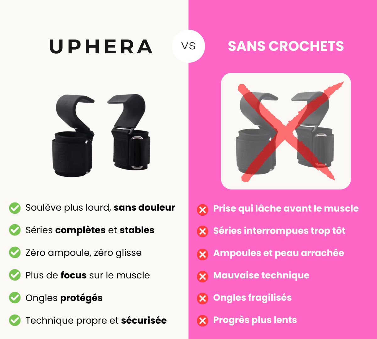 Contrairement aux sangles, les crochets Hera offrent une accroche instantanée et sécurisée sans avoir besoin de les enrouler autour de la barre. Ils sont plus rapides à mettre, plus confortables, et ne serrent pas les poignets.