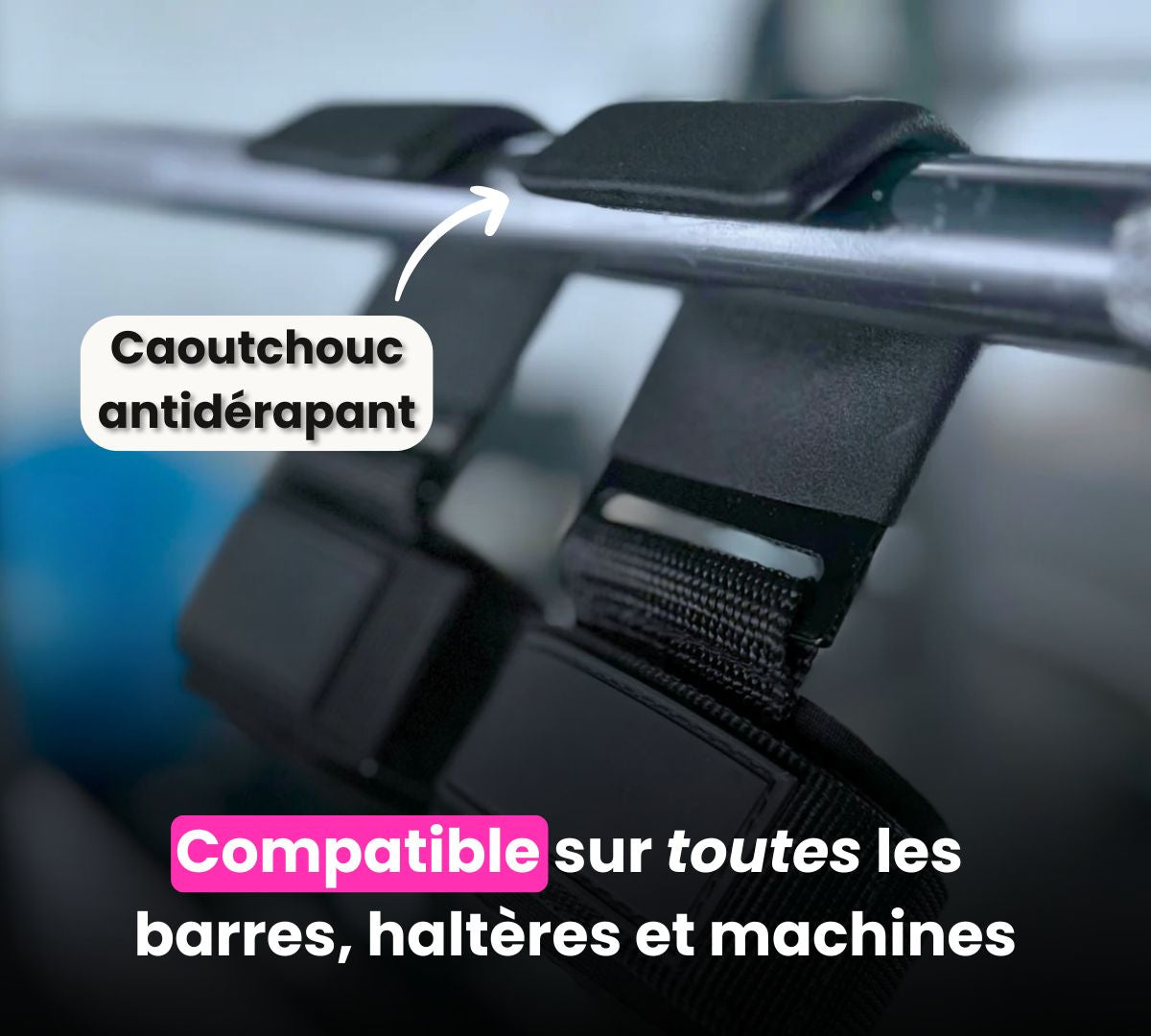 Oui ! Le crochet est en acier renforcé recouvert de caoutchouc antidérapant, assurant une excellente accroche sur toutes les barres et machines (tractions, tirages, soulevés de terre, etc.). Aucun glissement, même lors des séries lourdes.