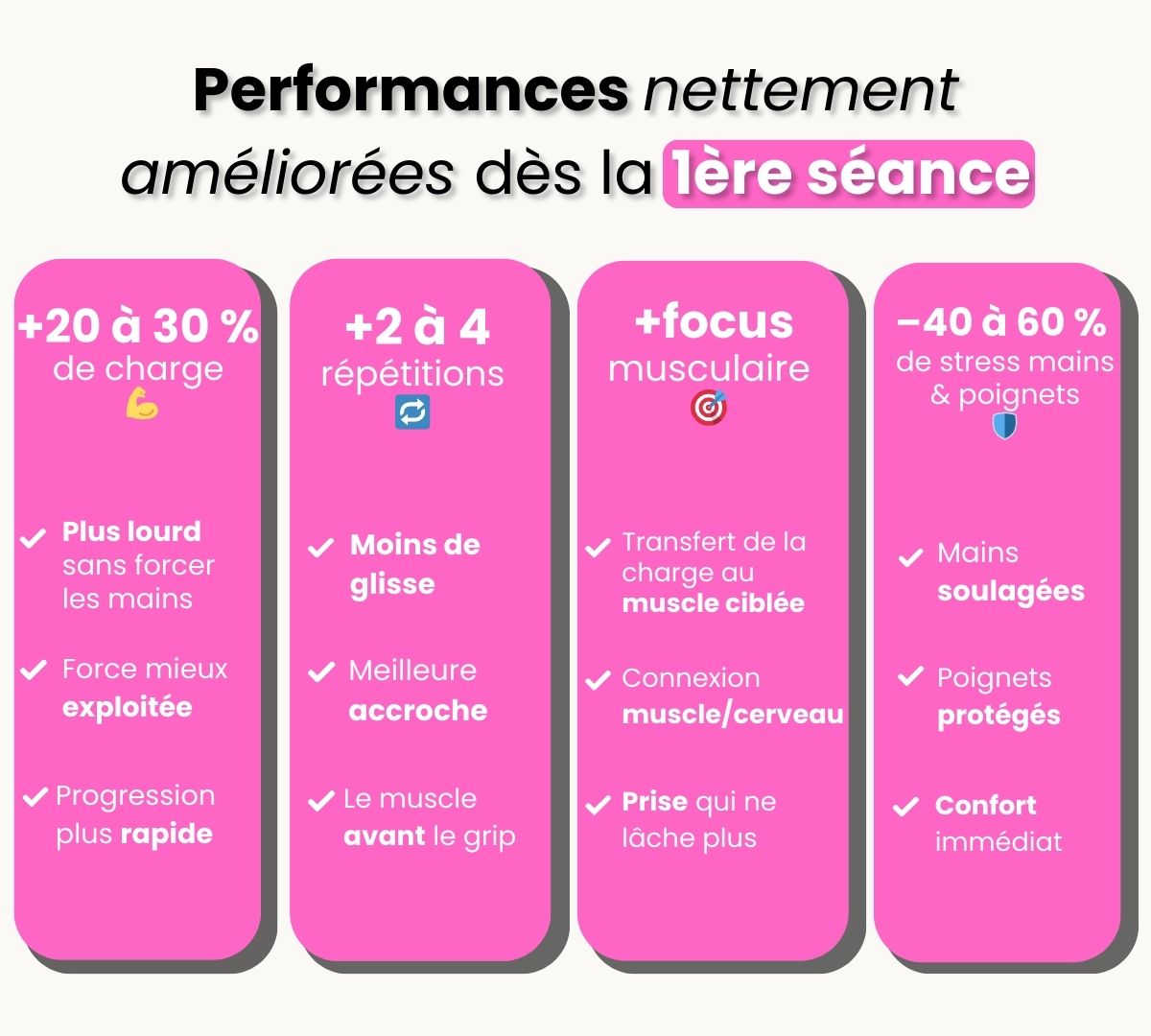 Ils réduisent la pression sur les poignets, améliorent la prise, et permettent à tes muscles du dos et des bras de travailler à 100 % de leur potentiel.