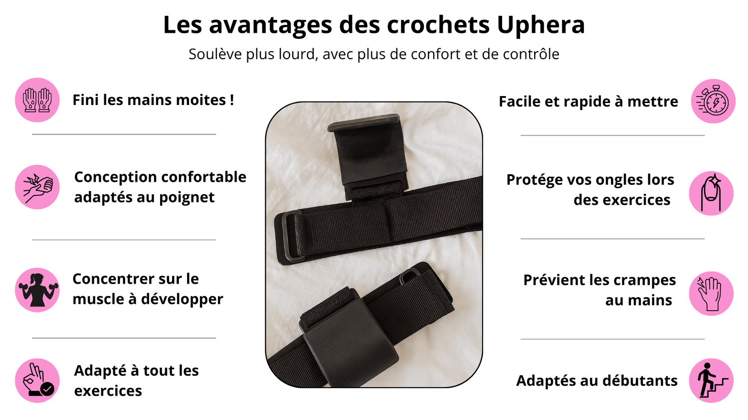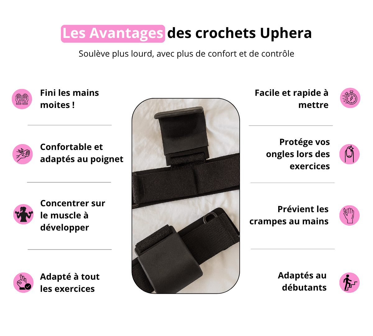 Contrairement aux sangles, les crochets Hera offrent une accroche instantanée et sécurisée sans avoir besoin de les enrouler autour de la barre. Ils sont plus rapides à mettre, plus confortables, et ne serrent pas les poignets.